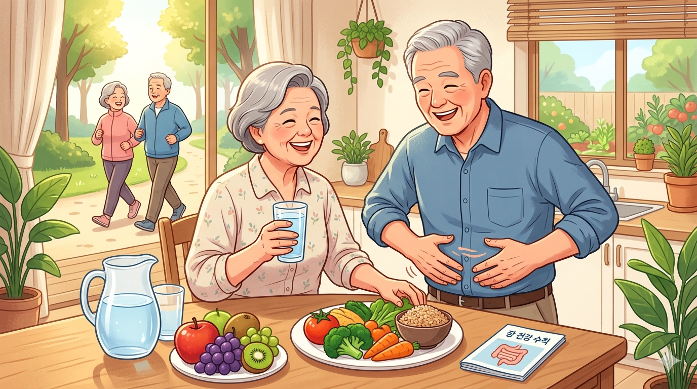 가장 먼저 실천해야 할 것은 수분 섭취의 습관화입니다. 장 속이 건조하면 변이 딱딱해지므로 하루 8컵 이상의 물을 조금씩 자주 마시는 것이 중요합니다. 식이섬유는 통곡물, 과일, 해조류(미역 등)를 통해 섭취하되, 생채소는 가스를 유발할 수 있으므로 익힌 채소 형태로 부드럽게 드시는 것이 좋습니다.